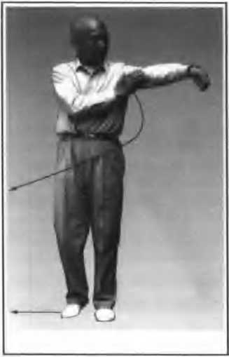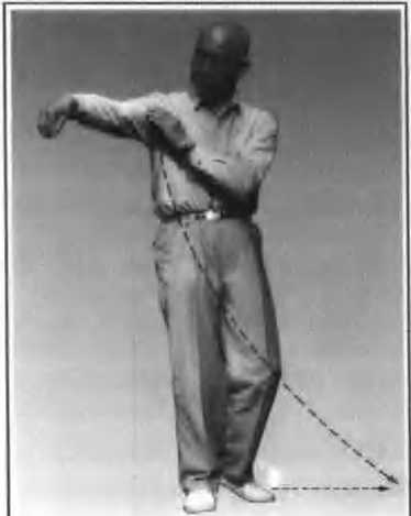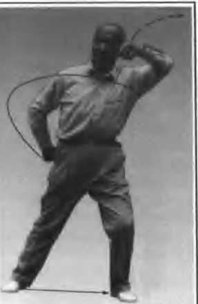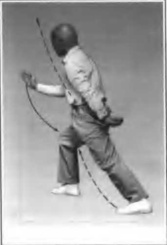 5. 左脚落于右脚后侧.脚掌着地.两脚掌随 同身体向左后(东南)碾转;右手走孤形上提. 至身体右侧变勾手,勾尖向下.与肩同高;左手掌 收于右上骨内侧,掌心向内;眼看有勾手(图63)。
