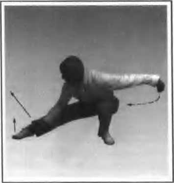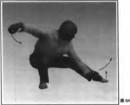 6. 右膝屈BL同时上身下降,落于右脚;左 脚向左(正东偏北)伸出.成左仆步;左掌经腹 前顺左腿内侧穿出,掌心向外,右臂随体降下 落;眼看左掌(图64)。