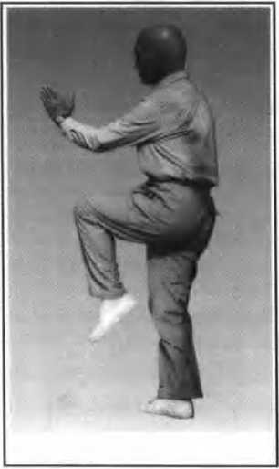 4. 上体右转,右脚尖外展,左脚尖内扣, 右腿前弓立起;右掌随体上升,至体前时翻 转下按于右胯侧,指向前;左腿随体上升屈 膝提起,脚尖下垂,左勾手勾尖转向上,随 体向前上时变掌挑起.成侧立掌.指尖高与眉 齐,肘尖向下;目视左掌(图61、62)。