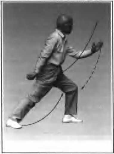 1. 上体稍左转.重心左移,成左侧弓步;左 臂内旋屈肘上撑,左拳停于左额前,拳心向外; 右拳自腰间向右后穿出,拳心向后;眼向前看 (图 58)。