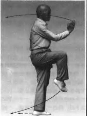 ,左脚尖外展,右脚尖内扣,左 腿前弓立起;左掌随体上升,至体前时翻转下按 于左胯侧,指向前;右腿随体上升屈膝提起,脚 尖下垂;右勾手勾尖转向上,随体向前上时变掌 挑起,成侧在掌.指尖高与眉卉,肘尖向下;目 视右掌(图65、66)0