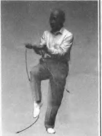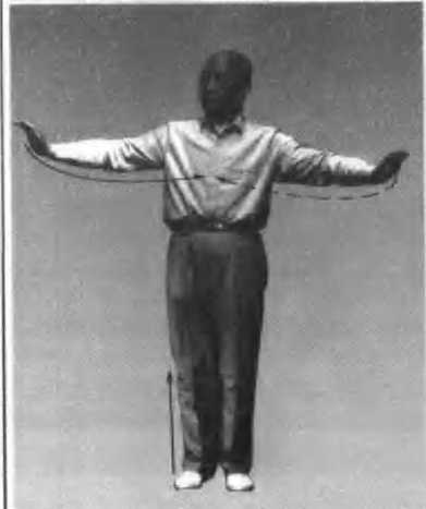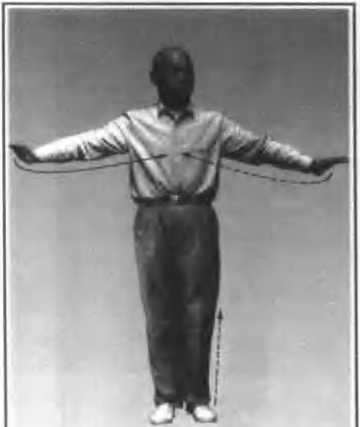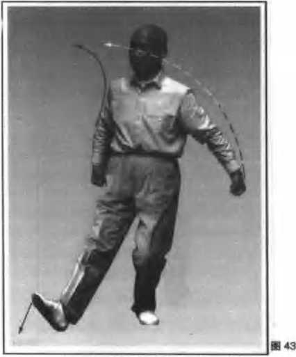 3. 右脚尖回勾,以右脚跟为力点,向右前 (偏西约30度)慢慢僵出;同时两手由上走弧形 分展于右前和左后,手指向上,两臂呈弧形,肘 尖向下;眼看右掌(图41)。