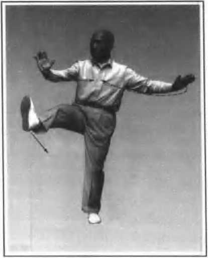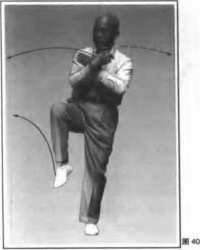 2.两手由下走弧形交叉于胸前,右手在外, 手心均向内,右腿屈膝提起:眼看右前方(图40)。