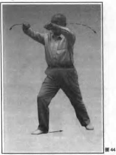 5. 右脚向前落下,脚跟着地;两手向下向后 走弧形,经胯的两侧时握拳向前弧形贯击.同时 右脚踏实成右弓步,拳高与耳平,相距同头宽, 拳心斜向下;眼看拳方(图43、44)。