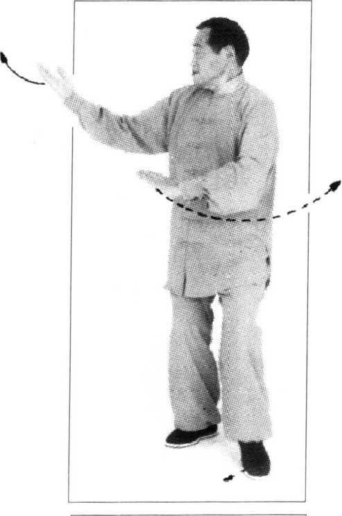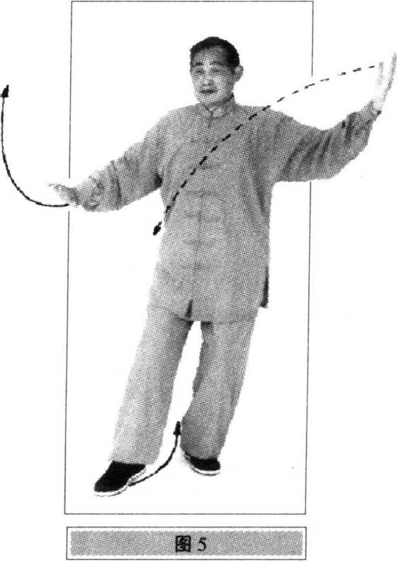 1 .上体微左转(左脚尖再稍微外撇),重心移向左腿;同 时,左手向下经腹前(手臂先内旋后外旋)向体左上方划弧; 右手(手臂内旋)经面前向左胸前划弧;眼看左手(图4)。
