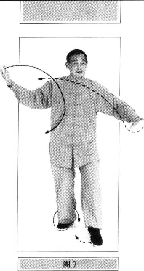 2 .上体微左转;同时,左手向下、向左搂掌,右手向体右 前上方扬举;左脚稍向前出虚步。其他动作参照左式(图7)。