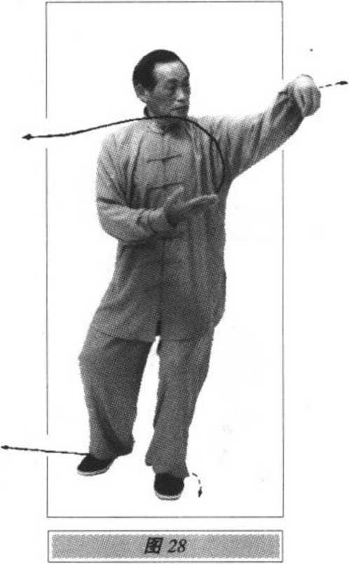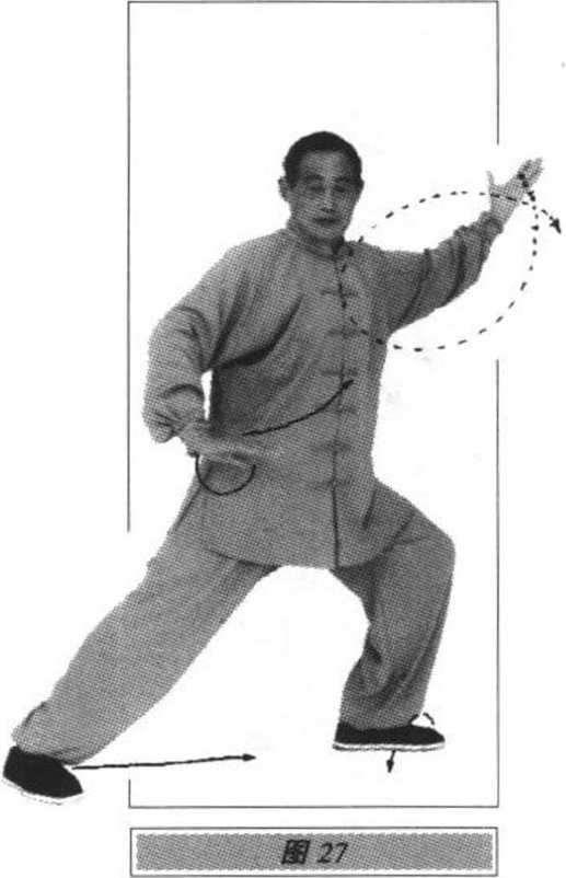 1.重心稍向左移,上体微左转,右脚尖内扣,重心移至右腿. 左脚收至右脚内侧成丁步;同时,右手臂内旋,向左划弧至右胸前, 手心向下,高与肩平;左臂外旋,左手逆时针抹一小平圆再向右划 弧至右腹前,手心向上,两手成“抱球”状;眼看右手(图26) o2.上体左转,左脚向东偏北(约15。)迈一步,脚尖外撇,重心 移至左腿成侧弓步,右腿自然伸直,脚跟外碾,其他动作与技术要 求参照右式(图27)。