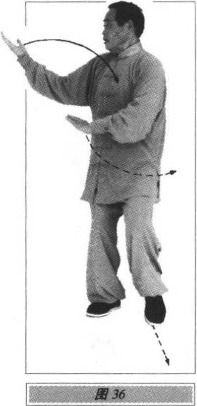 上体左转,左脚撤至与右脚齐,脚尖微外撇(两脚横向距离约 20厘米),重心移至左腿,随之右脚往前伸出虚步,脚尖点地;上体 继续左转,左手收至腹前,手心仍向上;同时,右臂屈肘,右手经耳 侧前推至胸前,手心向前,指尖向上,腕高不过胸(眼看右手),随之心羹舞云g 室踏恣建阵缨龄挣左手向后划弧平举,手心向上,右手再稍前推翻手心向上(右脚再 稍前伸,仍脚尖虚着地);脸向左转,眼看左手(图34、35)。