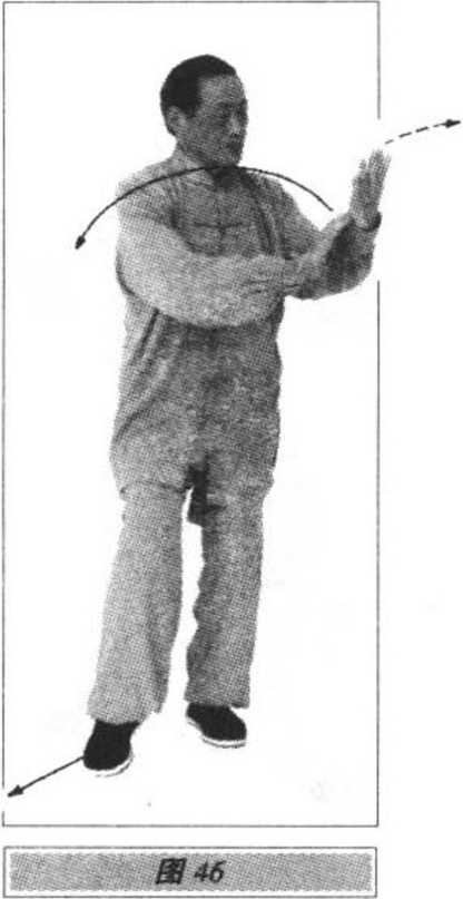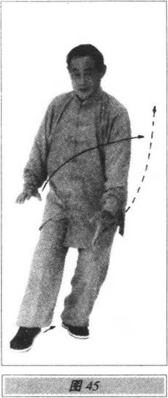 1.重心后移至右腿,左脚撤至右脚内侧,重心再移至左腿,随 之右脚跟提起前移成丁步;同时,上体先右转再左转,左手向右、向 下经左胯侧向左(偏后)划弧上举,手心向上,腕与肩平;右手向左 划弧至左胸前,手心向下;眼看左手(图44)。2.上体右转,右脚再稍前移,前脚掌着地成虚步;同时,左手 从耳侧向前下方插掌,指尖斜向下,手心向右;右手向右划孤按于 右胯旁,指尖向前(左肩前顺,上体稍前倾);眼看前下方(图45)o