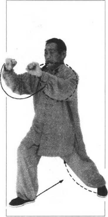 2.左腿屈膝坐胯,右脚向西南伸落,脚跟着地;同时,两手向 下、向后划弧回收至两胯前(贴近胯窝),手心均向上,紧接着重心 前移,右脚踏实,腿屈膝前弓,左腿自然伸直,与其同步,两手握虚 拳(先拳心向上,后随重心前移转拳心向下,达击点变实拳)从体两 侧向上(不要向体后抽拉)、向前损打(两拳臂在胸前合成钳形),两 拳眼斜向下,相距约一头宽,拳高与耳平;眼看前方(图61)o