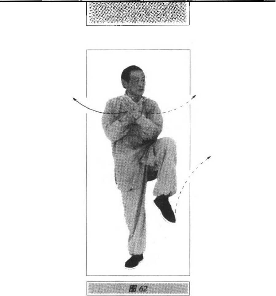 1.右小腿屈收,膝上提,小腿与脚尖自然下垂;同时,右手臂 外旋,手心向上,下落在右膝外侧;左手臂亦外旋,向前、向右划弧 至右膝内侧(两手心向上,肘微屈);眼看右前方(图60) o