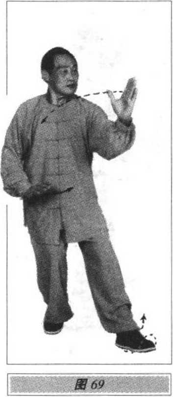 上体左转,右脚尖充分内扣,重心移至右腿;左脚提离地面逆 时针划圆并稍向前(向南)垫步,脚跟着地成虚步;同时,两手随着 体转(右手在上,左手在下,手心均向下)向左划弧,待快转至面向南时,左手逆时针划圆变侧立掌由腹前向上、向前(南)劈掌,手心 向右;右手向左、向下划弧按于右胯外侧,手心向下,指尖向前(两 手在右胸前一上一下交叉运动,右手臂走外,左手臂走内);眼看左 手(图 68、69)。