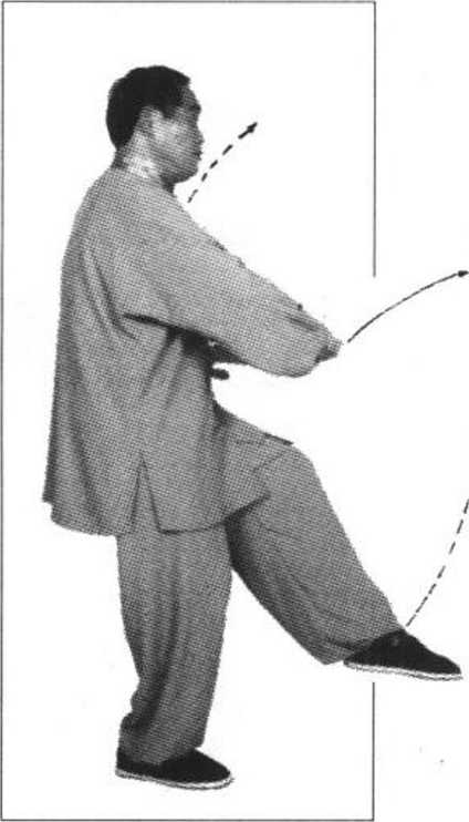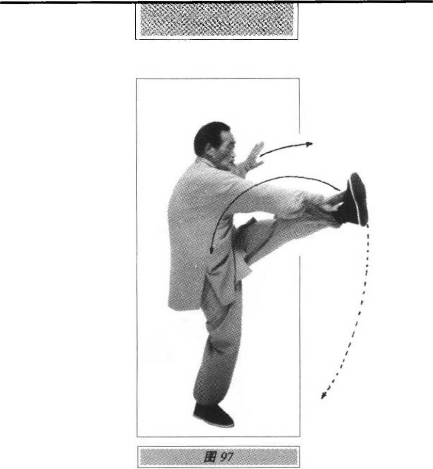 上接图94,重心后移至左腿,上体左转,右脚尖充分内扣,重 心移至右腿。上体继续左转至面向东,左脚提离地面稍向北移;同时,左手 向左经腹前划弧至左胯旁,手心向下;