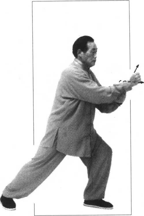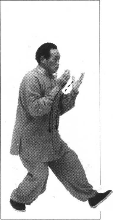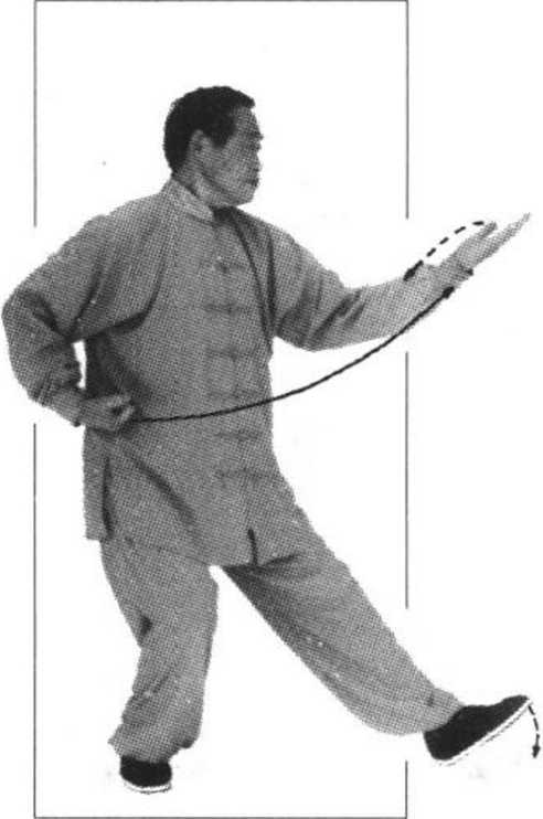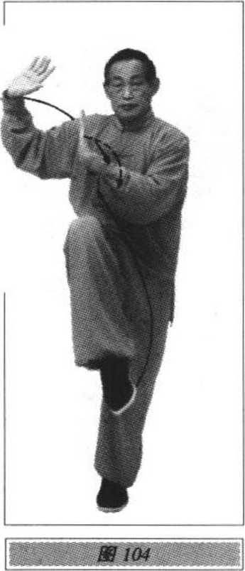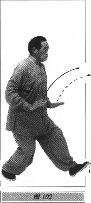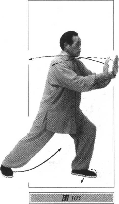 向左划弧至胸前,指尖向北,手心向下, 即可做左十字拍脚、冲拳、封闭势。其他动作与技术要求参照右式(图95、96、97、98、99、100、 101、102、103)。