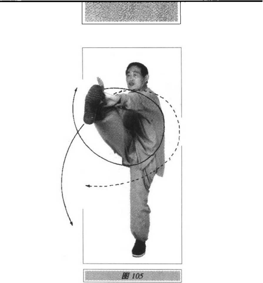 2. 右脚提起向左、向上、向右作扇形摆脚,脚面展平;同时,两 手自右向左摆掌,在体前左先右后拍击脚面(击声两响);眼看两手 (此为右摆莲脚)(图105)o