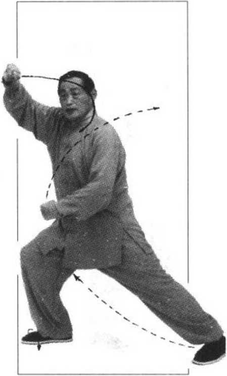 3. 摆脚后,上体右转右脚向右(偏北)落一步,先脚跟着地,然 后全脚踏实屈膝,左腿自然伸直,脚跟外碾成右侧弓步;同时,右手 向左、向下,经腹前向右上划孤变拳屈肘架于头的右上方,拳眼向 下,拳心向外;左手亦向左、向下经腹前向右划弧屈肘握拳至右腹 前,拳心向里,拳眼向上(两拳眼上下相对);眼看右前(南)方(此为 右打虎势)(图106) o