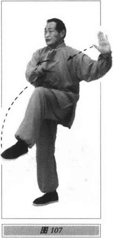 1. 上接图103,重心后移至右腿,上体右转面向南,左脚尖内 扣,重心移至左腿(坐胯膝微屈站稳),右膝上提至腹前,小腿自然 下垂并微外旋,脚面自然展平;同时,两手随转体向右划弧,右手举 于体右侧,手心向右前方,腕高与肩平,指尖向上;左手举于右肩 前,手心向右,指尖向上;眼看前方(图104)。