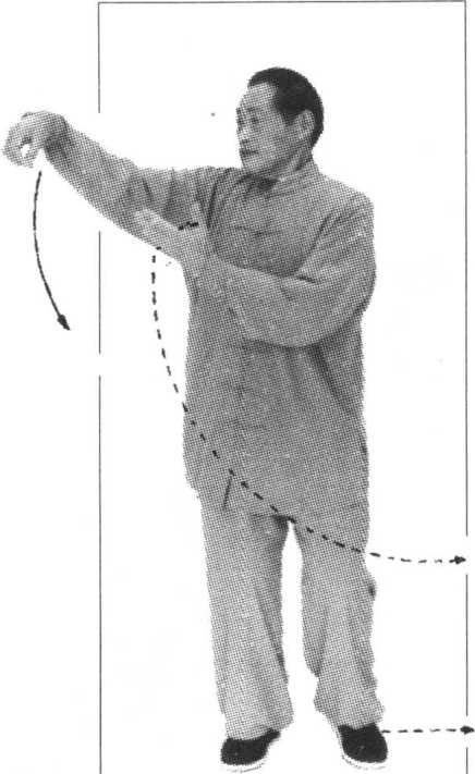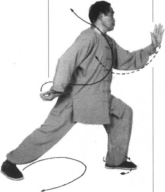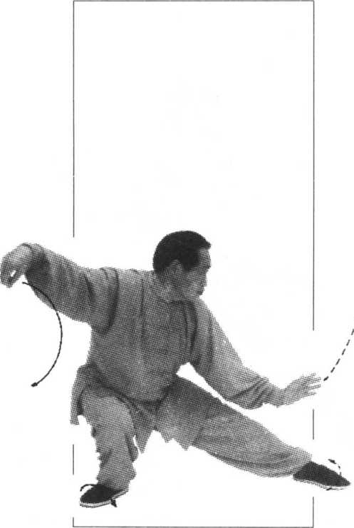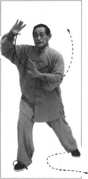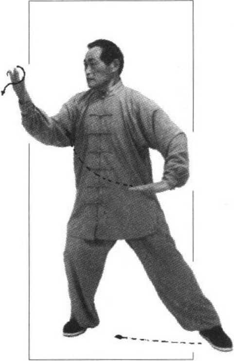 1.重心后移至左腿,上体左转,右脚尖内扣,左腿侧弓,右腿 伸直;同时,左臂外旋,勾手变掌,向右经腹前划弧至右胯前,再向 上经面前向左划弧至左肩前;右手向下、向左划弧至腹前;眼看左 手(图115)o2.按图110、111所示,两手再云转一个往复,即可转做左下 势。动作与技术要求参照右式(图116、117、118、119)。