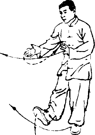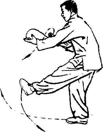 左腿在身前落地,重心移于左腿,两手变掌屈肘在身前合 抱,成右手在前、左手在后、两手心斜向对的截臂势;同时,右 脚尖勾翘,从身后向左前上方勾挂踢击。踢腿时,脚跟擦击地 面。踢腿勾挂至膝高,眼看前方。(图19)