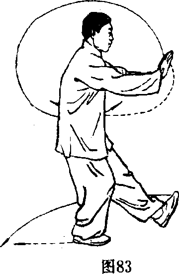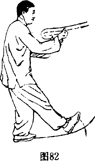 向前推出;同时,左小腿向前摆动,踢出左脚,脚尖上勾,脚跟 珊擦地面,眼看前方。(图83)