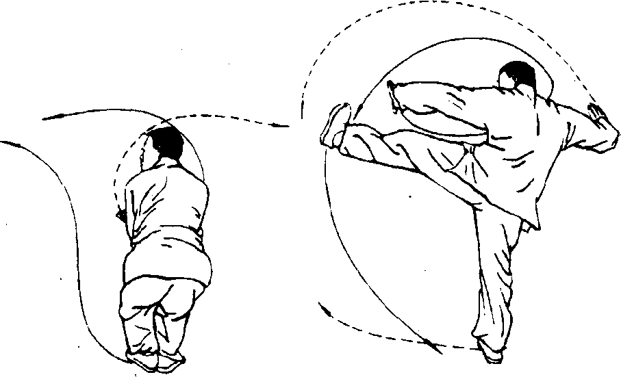 (2) 左右分掌要开要大,似鸳鸯展翅飞翔,力达手掌。左脚 侧蹬至胸高,力点达于脚跟。