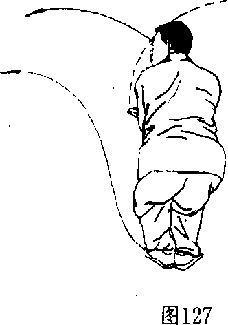 (1) 左脚向后落步,身体左转90、两掌左右分开划弧交 叉于腹前,右脚向左脚靠拢成并步,两膝弯曲,重心下降,眼视 左方。(图127)