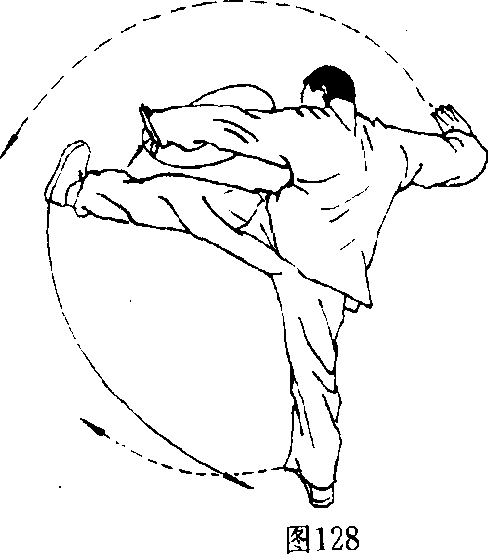 (2) 提高重心,左脚向左上方侧踹,脚尖回勾,上身略前 俯;同时,两掌左右分撑。左掌与左腿侧踹的同时向斜前方向 撑开,掌心朝前,右掌向斜后撑开,掌心朝后,眼看左手左脚。 (图 128)