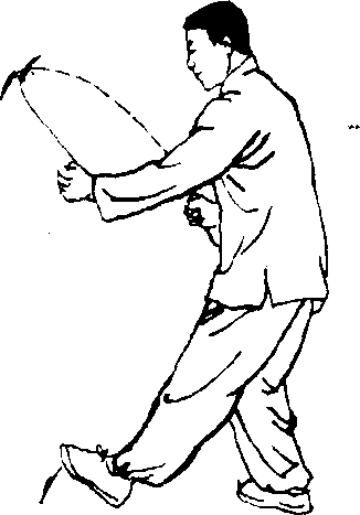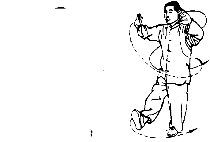 (2) 左右分掌要开要大,似鸳鸯展翅飞翔,力达手掌,左脚 侧蹬至胸高,力点达于脚跟。