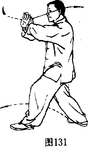右脚1前落,重心移于右腿,左脚尖内扣,右脚尖外展,体稍 右转,双臂挥拳,左拳在上,右拳在下,由身体左侧向上、向前、 向下划一弧形,成左拳在前,右拳在后的双砸拳,同时,左小腿 向前摆动,踢出左脚,脚尖上勾,脚跟股擦地面,眼看双拳。(图 130)