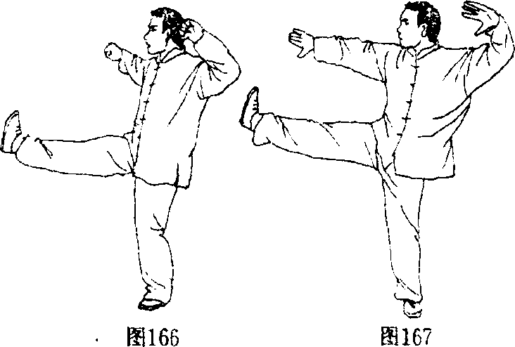 侧蹬腿时呈三体步,左(石)脚垫步,上体迅速(左)右转. 变为侧身,右(左)腿由后向前斜上抬起,脚尖回勾,随即伸直, 蹬击对方胸肋等部位,力达脚跟。(图167)