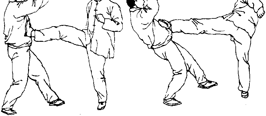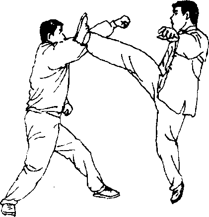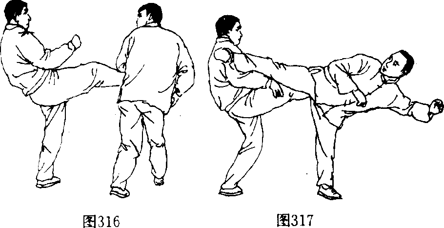 体前偏右突停,并屈膝收回成提膝独立式。然后,甲方右 腿屈膝伸出,用脚后跟蹬踢乙方腹部。(图314)