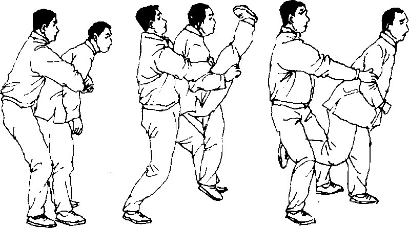甲方并步站立,乙方从后双手抱住甲方双臂。(图390)