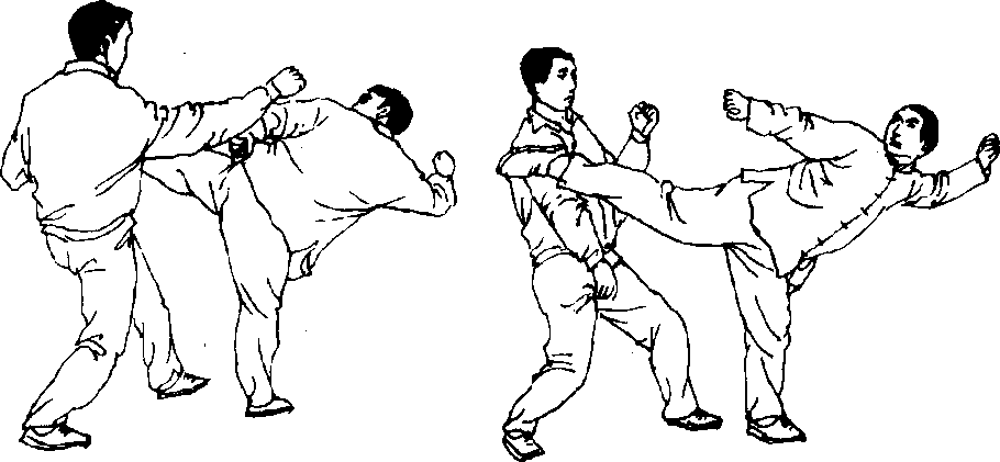 乙方头后仰,双手松开甲方,甲方右腿顺势由上向下后 摆,用脚跟勾点乙方裆部。(图392)