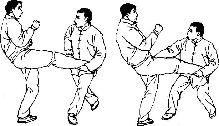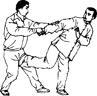 甲方左脚在前站立,乙方右脚踹蹬甲方腹部,甲方左脚后 撤,等乙方右腿伸直时,甲方上步,同时左手抱挟乙方右腿。 (图 396).