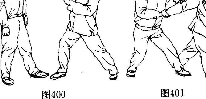 乙方右手刁住甲方右腕,左手托住甲方肘部,反臂拧压甲 方,甲方右臂内旋,同时左转身,左脚向右脚后插步。(图401) 然后,甲方左脚支撑重心,右脚由下向后、向上撩击乙方 下颌部及面部,脚面绷直,力达脚掌和脚跟。(图402)