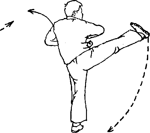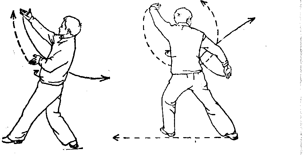 2 .上体微前倾,右手向后划弧撩掌,左手向上划弧架 挡。眼看右掌。(图47)