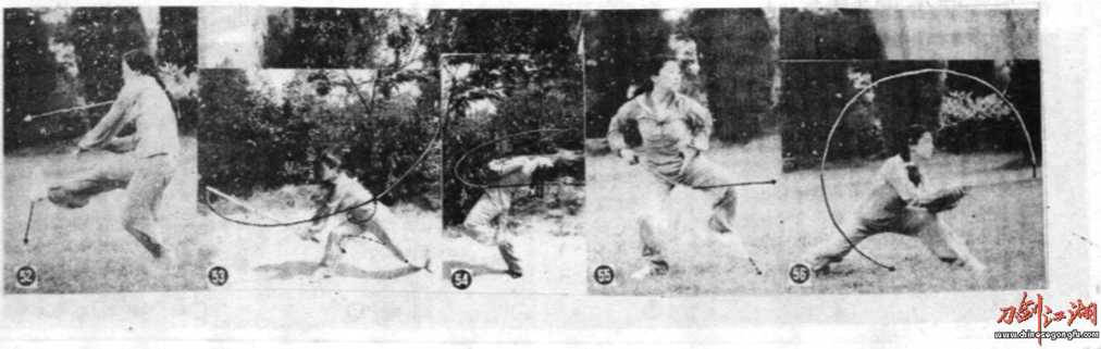 动作爪心前移左脚提起双手分开右手握刽(图45)。左脚落在原处右手握剑内旋腕从身体左例挽绕一周,左手护右腕同时右左脚蔺右腕变外旋使剑从身体右侧向的向下、向后挽绕一周同时左脚提起(图47)。左惭落于右庐前同时双手握剑向前轲点(图48)。