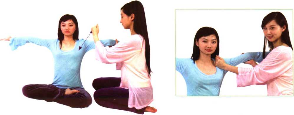 请被关怀者正坐,手臂打 直向后勾起,掌心朝上,指 尖朝上。助人者以凤拳振动, 左右轮流,共约3分钟。