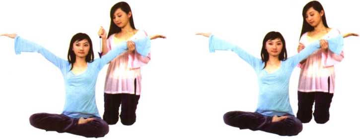请被关怀者正坐,手臂打直外张、上抬尽量与肩齐高,拇指外张、四指并拢,掌 心朝上。助人者以龙拳振动,左右轮流,共约3分钟。