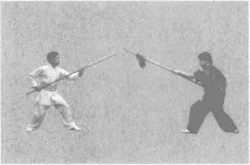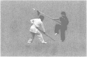 乙左脚在前,两腿微屈成左犁头桩,左手在前屈肘握枪,枪尖与眉同高,右手 握枪放在腰旁成格斗式,面向甲站立(图5-13 )。