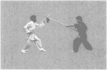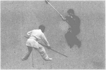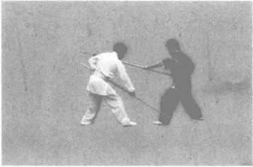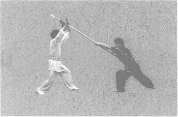 (3) 上动不停,甲右手握棍,棍把向前下扫击乙前腿(图5-15)。