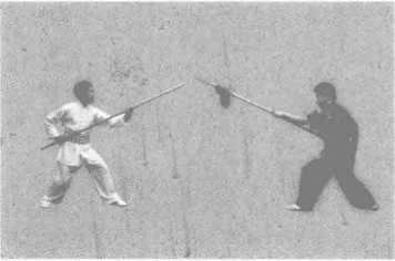 乙左脚在前,两腿微屈成左犁头桩,左手在前屈肘握枪,枪尖与眉同高,右手 握枪放在腰旁成格斗式,面向甲站立(图5-ll)o