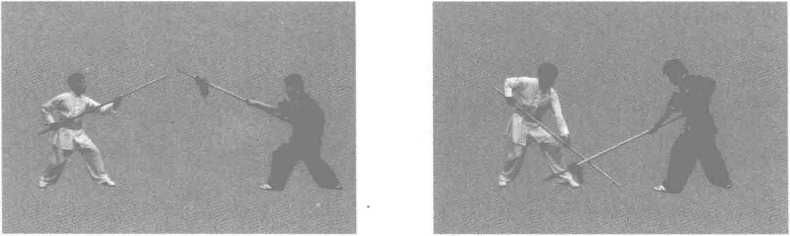 上动同时,甲左手握棍,以左腕为轴,从右向左格拔乙刺枪(图5-14 ) 0
