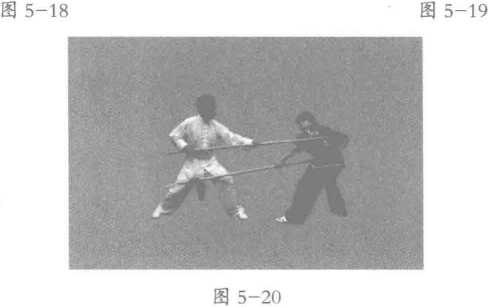 上动同时,甲左手握棍,以左腕为轴,内翻左腕,从左向右下格拨乙下刺枪 (图 5-19)0