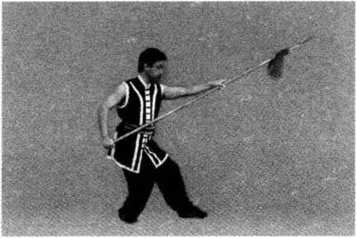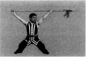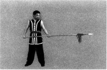 左脚在前,脚全掌着地,脚尖微向身体左前方,膝微弓曲;右脚在后,脚全掌着地, 脚尖与左脚尖平行;引体,重心前三后七,上体微前倾;左手在前,微曲肘,手心 向下.五指分开,抓握枪杆中部,枪尖与眉同高;右手在后,手心向内,虎口朝前. 五指分开握把,枪把紧贴身体右胯傍傍;目视枪尖(图3-1)