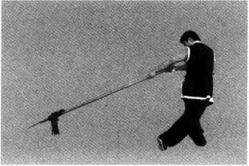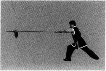 (2) ±体略前倾,双手握枪,左手前,右手后,向前中平扎枪(图3-3 )0
