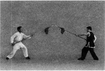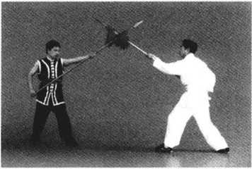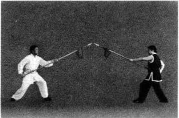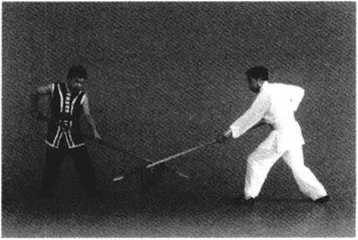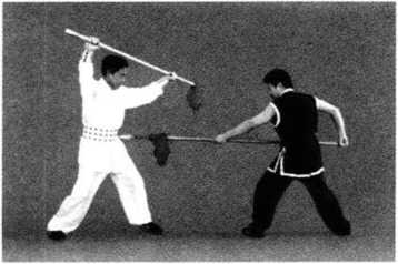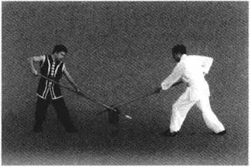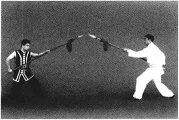 1. 甲、乙两方各左脚在前,屈膝半蹲成犁头桩,右手握把,左手持枪相对站立(图 5-17 )0