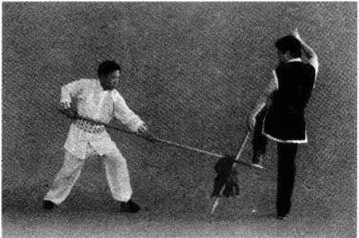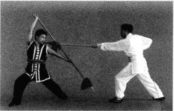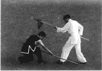 5. 上动不停,乙上体下蹲,右脚向前上一大步,左手滑握枪缨部分;右手滑握 枪杆中部,用枪把从右向左下横扫甲双脚(图5-30)甲可双脚起跳,腾空防开乙 下扫把(图5-31 )。