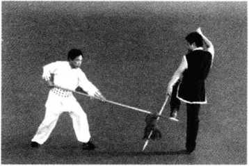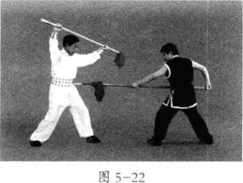 5. 甲左脚向前上步.双手持枪,枪尖向R刺向乙腿 乙向前提左膝,双手持枪, 右手握把从后向上.左手持枪从上向右下.用枪前-:分之一处向右格挡甲枪尖(图 5-21 )
