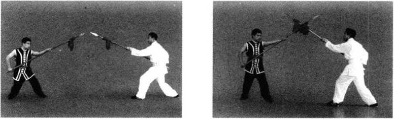 2. 甲左脚向前上半步,右脚向前跟上半步成半弓步,双手持枪向乙头上刺枪 上动同时,乙石手握把,左手持枪从右向左翻腕,从右向左格拨甲枪尖(图5-24)